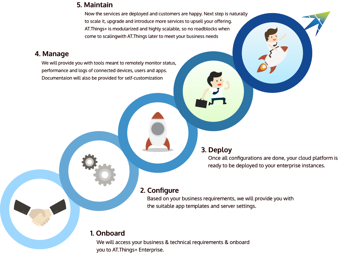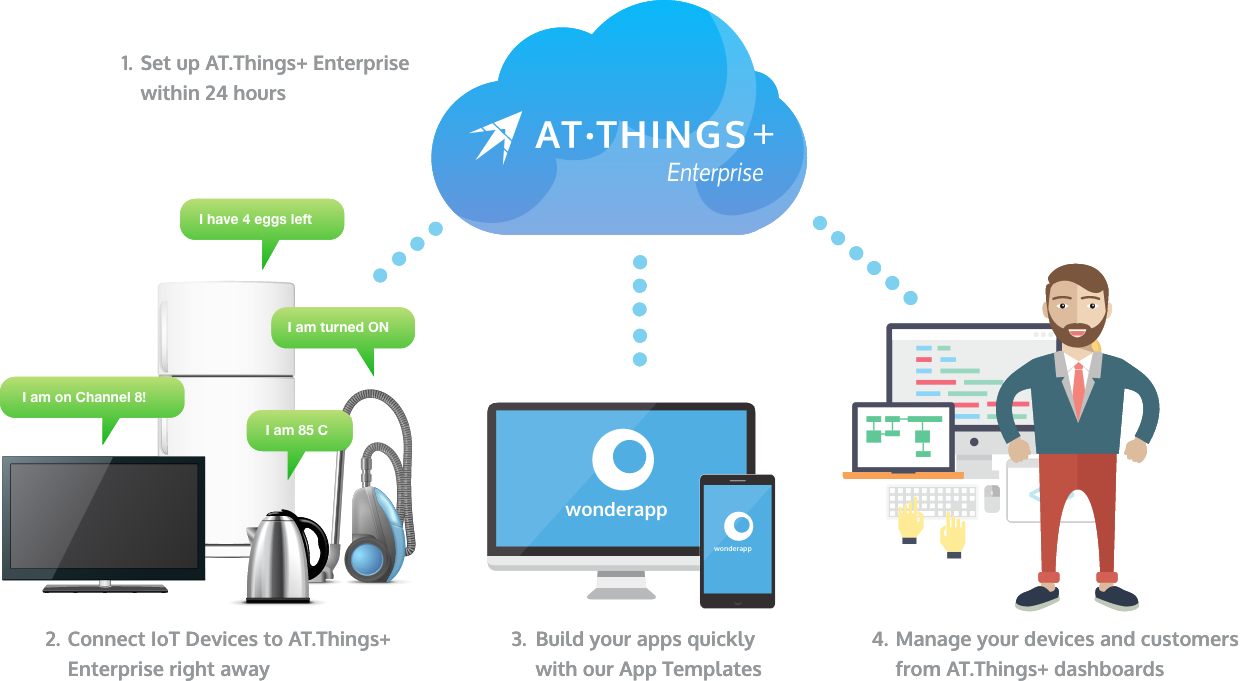 Owning, running & managing Enterprise IoT Cloud Platform has never been easier, quicker and cheaper. AT.Things+ Enterprise is an IoT enablement platform that provides all you need to bootstrap your own IoT cloud platform from the tools and application codes to technical know-how and supports that you need to build, run and manage IoT services on your own IoT cloud platform - with minimal fees and no strings attached.