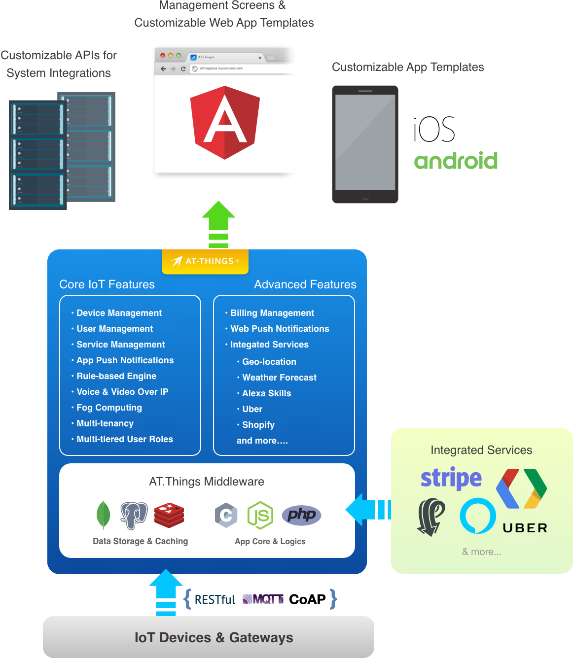 We have a long list of integration with popular services such as Amazon alexa, forecast.io, GCM, APNS, stripe, Uber for advanced features such as VoIP services, push notification alerting, P2P control, billing management, weather and location services for your IoT business.
